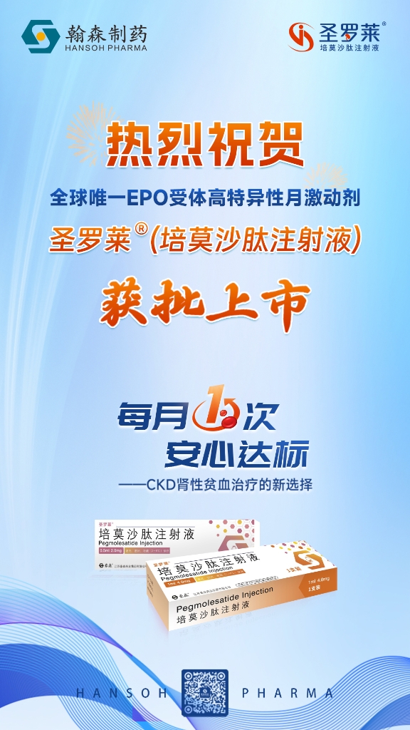 On June 30, Hansoh Pharma's Saint Luolai(Pegmolesatide Injection) ,the global unique once-monthly peptide-based highly specific EPO receptor activator【PERA】,was granted approval by the National Medical Products Administration (NMPA) for marketing. This approval is for the treatment of anemia due to Chronic Kidney Disease (CKD), including adult non-dialysis patients who are not receiving Erythropoiesis Stimulating Agent (ESA) and adult dialysis patients receiving short-acting Erythropoietin (EPO). Saint Luolai now becomes the seventh innovative drug from Hansoh Pharma to receive marketing approval.